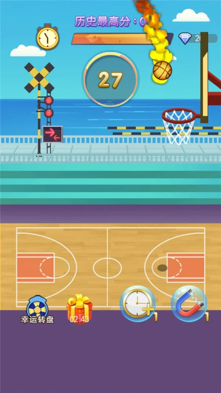 2.运用垂直游戏模式,通过一个手指操作控制篮球快速投篮,争取获得更高的分数。