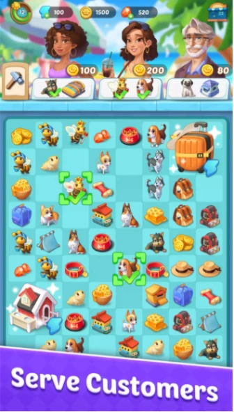 5、合成玩法:以合成元素为核心,获取道具满足顾客需求,恢复小镇生机。