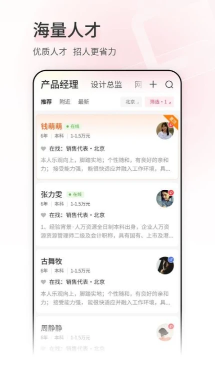 1.聚焦北京市场,建立覆盖朝阳、海淀等16个行政区的职位数据库,实现区域精准匹配。 2.拥有超过50万注册求职者与2万家认证企业,构建活跃的本地职场生态。 3.支持上传PDF/Word等多种格式简历,智能解析系统自动生成可视化简历亮点。 4. 开通企业VIP通道提供专属招聘顾问服务,支持批量面试邀约与薪酬谈判指导。 5.搭建职场社交圈功能,用户可创建行业交流群组获取内推机会。