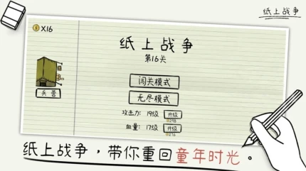 纸上战争是一款结合策略与创意的对战游戏。玩家需在纸面战场指挥军队,通过绘制武器提升战斗力。闯关模式包含不同挑战,无尽模式考验持久作战能力。观看视频可获取援助,购买高级武器增强胜率。