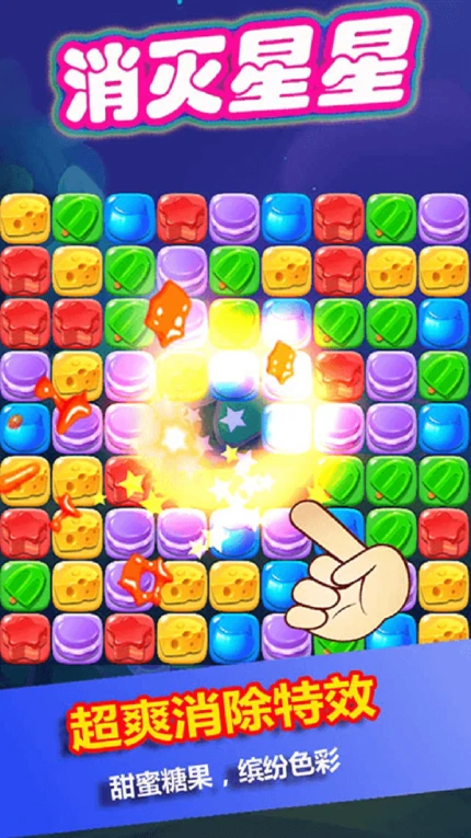 继承传统消除游戏核心机制,创新性地将糖果元素与星星造型结合,通过动态光影效果强化消除反馈。每完成一次连锁反应,系统即触发专属粒子特效,配合音效设计形成多感官联动体验。