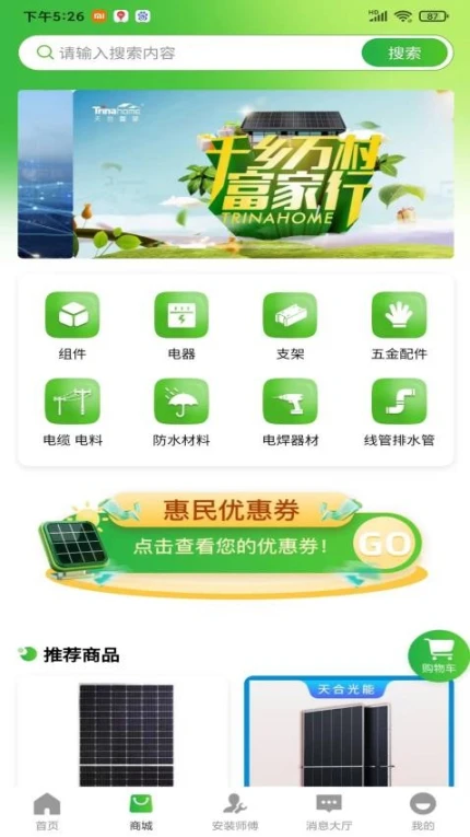 光伏惠民网APP是一款专注于光伏产品服务的综合性平台,为用户提供便捷的光伏服务。在管理方面,用户能一手掌握安装光伏产品的数量,及时了解安装补贴信息,获取更多福利。学习功能上,可在线学习专业的光伏科普知识,轻松掌握光伏系统问题的解决方法。购物体验上,平台提供专业购物服务,汇聚各类产品,满足用户的选购需求,并能将产品极速配送上门。同时,平台还提供同城附近光伏安装师傅的查找服务,方便用户解决安装问题。
