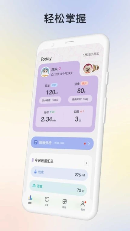 实时汇总养宠数据,并进行周报分析,帮助用户更好地管理宠物生活。