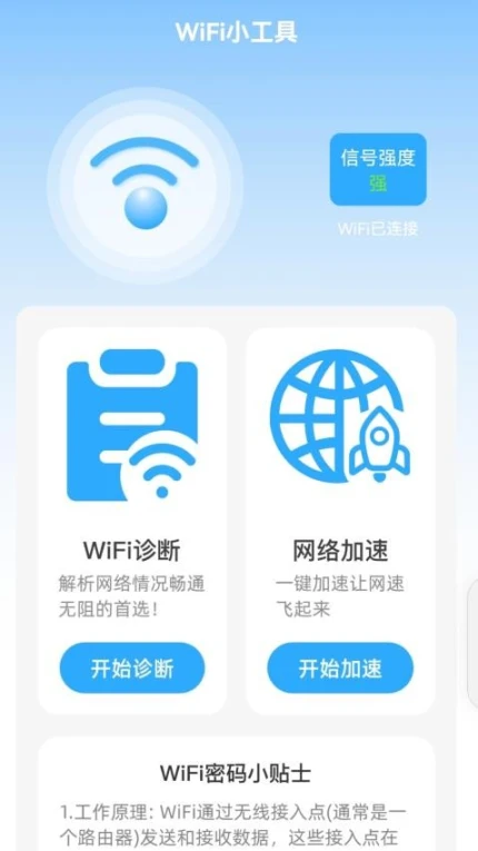 蓝天下载站为您免费提供5GWiFi精灵官方版下载,这款系统工具应用专为家庭网络优化而生。用户可通过5GWiFi精灵app下载v2.0.1安卓版,一键检测WiFi信号质量、定位网络故障并加速数据传输。内置的网络诊断功能可解析路由器连接状态,实时显示信号强度与延迟数据,帮助用户快速排查断连、卡顿等问题。工具箱模块支持繁体简体转换、金额大写生成及汉字转拼音,满足多场景文字处理需求。界面采用极简设计,操作逻辑清晰,特别适合对网络稳定性要求较高的家庭用户。