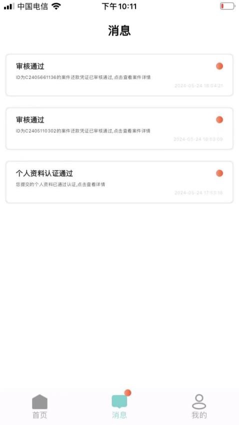 4、在消息中心查看案件审核进度,点击通知链接可查看详情
