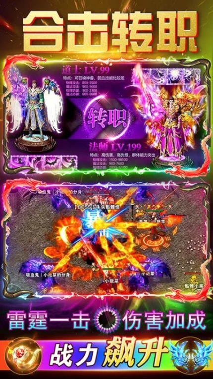 4、合击转职系统实现角色实力跃升,雷霆一击技能触发时伤害加成突破常规。