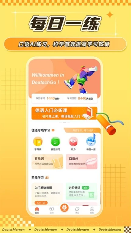 蓝天下载站为您提供德语GO软件免费下载。这款专为德语学习者打造的在线平台,整合字母表、语法、词汇等核心模块,支持零基础用户系统化入门。内置真人教师答疑、智能口语测评及海量题库资源,帮助用户高效突破听说读写难关。最新版本新增双语新闻模块,进一步拓展学习场景。通过设定个性化学习目标,用户可科学规划每日任务,结合趣味练习巩固知识点,轻松实现德语能力阶梯式提升。