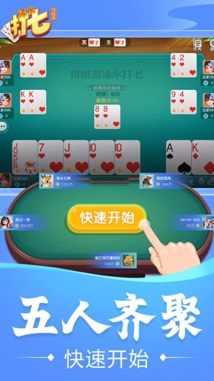 蓝天下载网为您免费提供同城游浠水打七下载,同城游浠水打七是一款多人竞技的棋牌桌游,具有精美的画面设计,带来舒适视觉体验。该游戏发源于湖北黄冈市浠水地区,玩法灵活多变,融入数点、抱卖鸡和找朋友玩法,提高了对抗性。在线模式下玩家能轻松开局,以浠水地道规则为基础,结合简单操作与流行元素,可随时邀请好友对局,享受刺激牌技比拼。