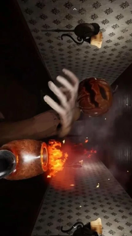 随机触发的万圣节南瓜头攻击事件、突然坍塌的地板等意外场景,要求玩家快速反应。特殊场景如镜屋会复制玩家动作,需通过破坏镜面寻找出口,场景切换时伴有低频音效增强压迫感。