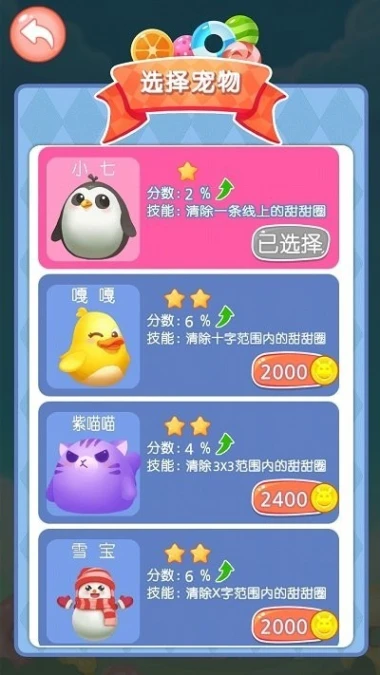 5.企鹅宠物增添趣味,选择的企鹅宠物会出现在消除界面,让画面更有趣味性。