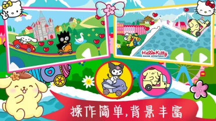 游戏汇聚凯蒂猫、库洛米等20+三丽鸥人气角色,支持自由切换外观并解锁专属皮肤,满足收藏爱好者需求。角色动作设计细腻,奔跑、跳跃时的动态表现强化了萌系氛围。