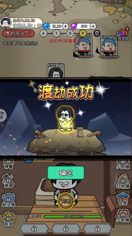 4.渡劫闯荡,渡劫后进入下一阶段,跟随主线闯荡获取灵气。