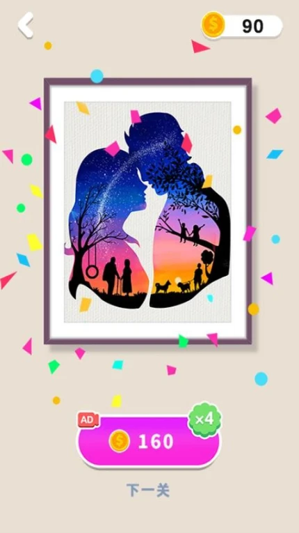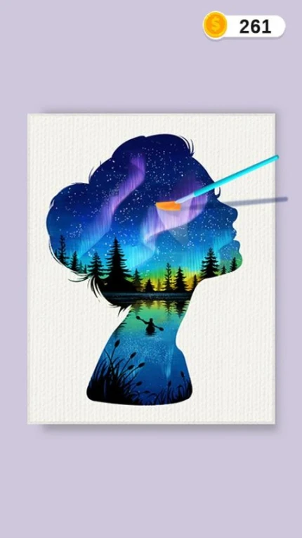 流光剪影是一款将绘画艺术与闯关机制深度融合的创新作品。游戏采用「调色-涂鸦-剪影」三段式创作流程,玩家需先通过色卡匹配系统获取符合主题的颜料,再运用真实笔刷工具进行渐变上色,最后通过遮盖技法完成剪影创作。系统内置的风景人形剪影模板库,支持玩家自由组合不同图形样式,配合可解锁的创新性关卡,形成兼具挑战性与艺术性的成长体系。游戏内设的金币奖励机制,更通过观看视频获取成倍奖励的设计,强化了玩家的创作动力。
