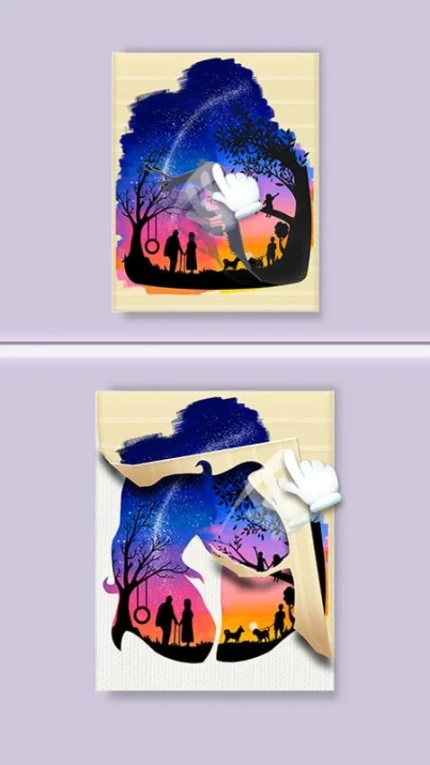 创新性地将遮盖技法融入数字绘画流程,玩家通过撕下预设遮盖层即可呈现剪影效果,这种物理绘画与数字创作的结合,既保留了传统艺术的仪式感,又突破了空间限制。