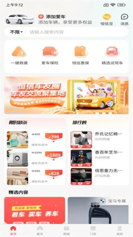 恒信车管家app是一款集车辆管理、交易服务与生活权益于一体的综合性平台。用户通过添加爱车信息,可实时获取保养提醒、保险续费等个性化服务。平台整合新车销售、二手车交易功能,支持车型筛选与线下门店导航,满足购车、换车需求。此外,限时秒杀专区提供车品优惠,车主生活板块覆盖洗车、道路救援等场景,形成完整的汽车生态闭环。