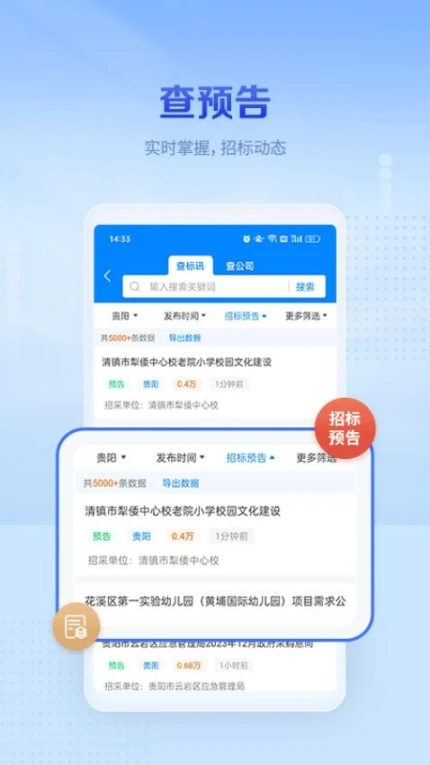 今日招标官方版提供六大核心功能:项目搜索支持关键词定位,城市筛选精准匹配地域需求,招标信息查询实时更新,项目预告提前把握商机,采购信息对接直接触达客户,企业监测功能实现竞对动态追踪。用户可通过多维度筛选快速锁定目标项目。