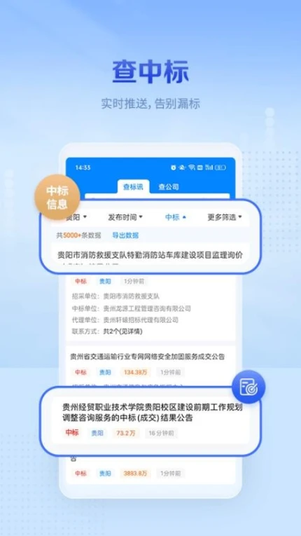 基于用户行为分析的精准推送,支持自定义关键词过滤,中标结果变动即时通知,推送准确率达92%以上。