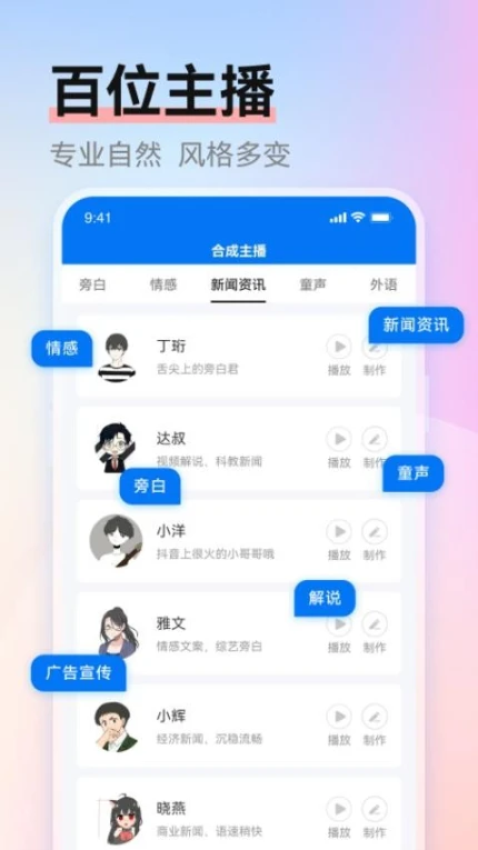 1.主播挑选:应用中提供各个主播的声音效果,可通过选择主播来生成配音。