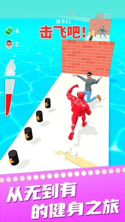3.能实现猛男养成,在挑战过程中使角色慢慢变成猛男,击打跑酷中的障碍物。