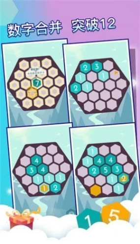 4.观察每个六边形上的数字,将其完整融合,最终合成数字12完成拼接任务。