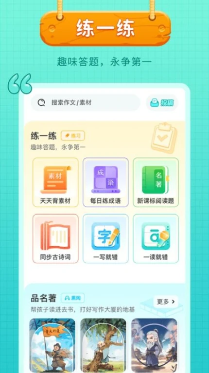 应用内置趣味答题系统,涵盖文学常识、写作技巧等多类题目,通过游戏化设计提升学习趣味性。用户可参与文学榜单竞争,查看实时排名激发创作动力,期末考限定抽奖活动提供实物奖励。