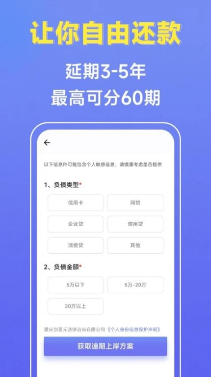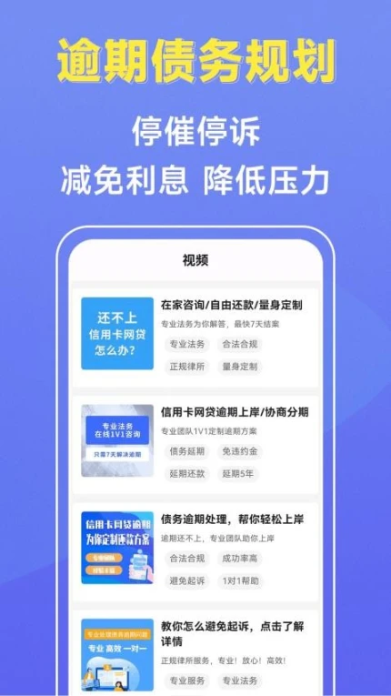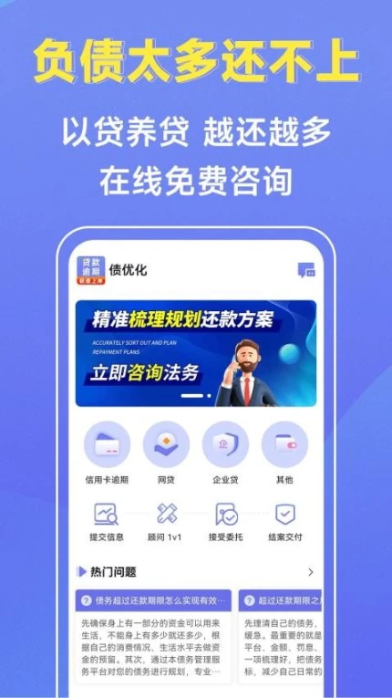 债优化app是一款专注于债务管理的工具型应用,支持全国各类债务逾期处理。用户可在线获取免费法律咨询,通过智能系统生成个性化还款方案,实现债务压力可视化。平台提供停催停诉服务,有效缓解用户心理负担,同时支持利息减免与分期延期操作,帮助用户重建信用体系。